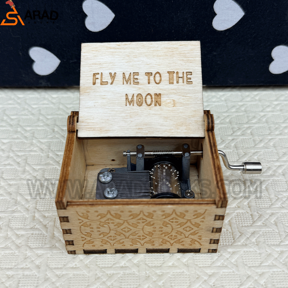 این جعبه های موزیکال از جنس چوب و دارای حکاکی میباشد. با چرخاندن اهرم کنار جعبه جهت عقربه های ساعت، شروع به پخش بخشی از اهنگ Fly me to the moon میکند. ابعاد این جعبه ها 4*5*6 سانتی متر میباشد. این جعبه های موزیکال در طرح های مختلف در فروشگاه موجود است.