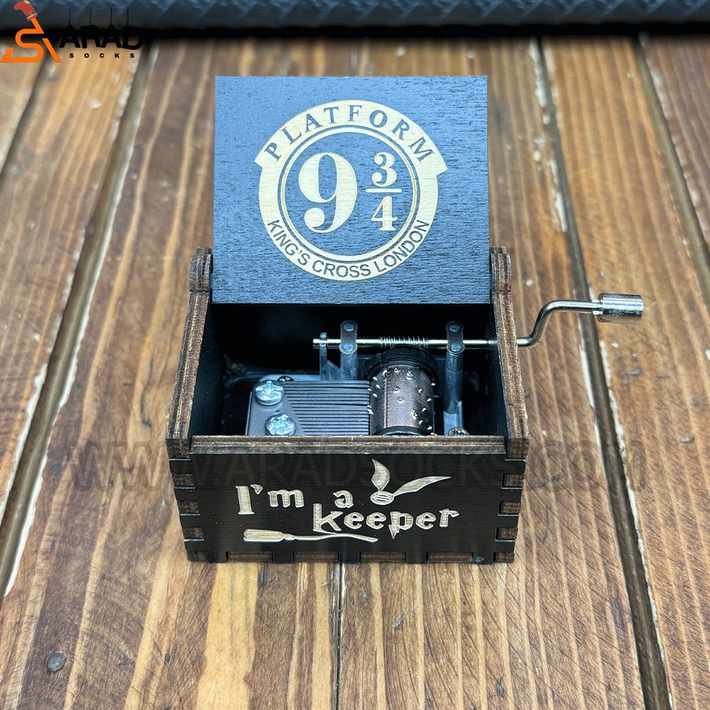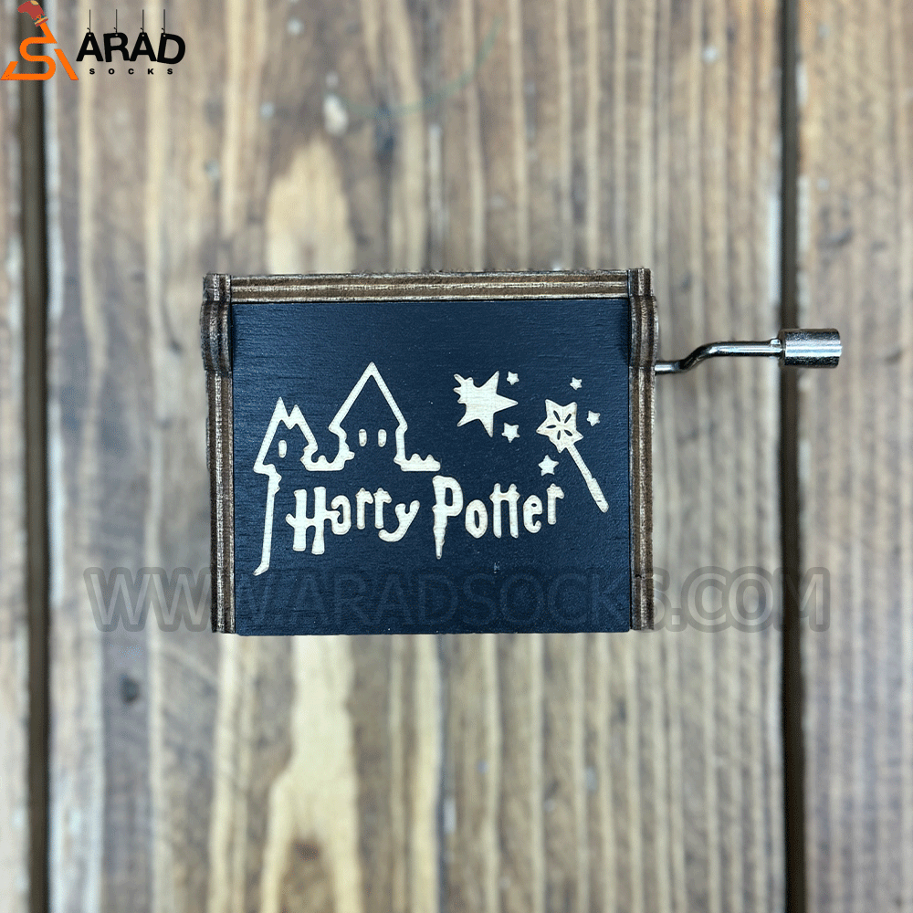 این جعبه های موزیکال از جنس چوب و دارای حکاکی با طرح هری پاتر میباشد. با چرخاندن اهرم کنار جعبه جهت عقربه های ساعت، شروع به پخش اهنگ هری پاتر میکند. ابعاد این جعبه ها 4*5*6 سانتی متر میباشد.