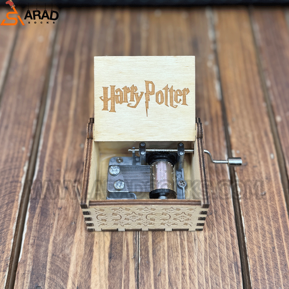 این جعبه های موزیکال از جنس چوب و دارای حکاکی با طرح هری پاتر میباشد. با چرخاندن اهرم کنار جعبه جهت عقربه های ساعت، شروع به پخش اهنگ هری پاتر میکند. ابعاد این جعبه ها 4*5*6 سانتی متر میباشد.
