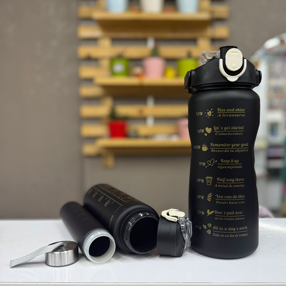 این قمقمه جذاب و مناسب شامل سه قمقمه مجزا و کاربردی میباشد. قمقمه بزرگ با گنجایش 2 لیتر که نیاز شما را برآورده میکند، دارای نی و دستگیره برای حمل آسان آن است. قمقمه متوسط با گنجایش حدود 750 میل بسیار خوش دست است و به راحتی توی کیفتان جا میشود. و قمقمه کوچیک با گنجایش 280 میل یک قمقمه کوچک و کاربردیست و در آن به صورت پیچی کامل باز میشود.
