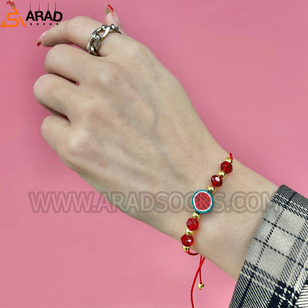 دستبند یلدایی زیبا طرح هندوانه که گزینه مناسبی برای هدیه به بانوان در این شب زیبا می باشد. این دستبند دارای مهره های کریستال است، که سایز این محصول توسط یک بند کوچک و بزرگ می شود.