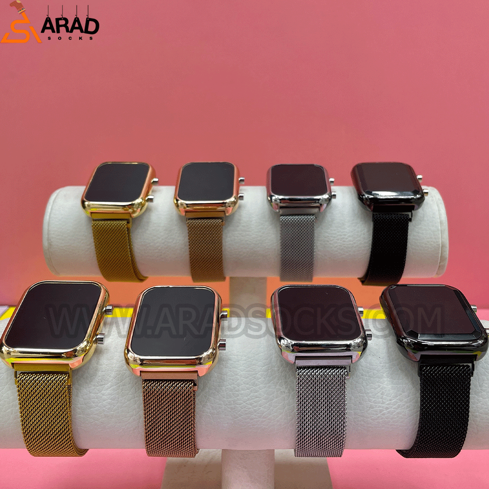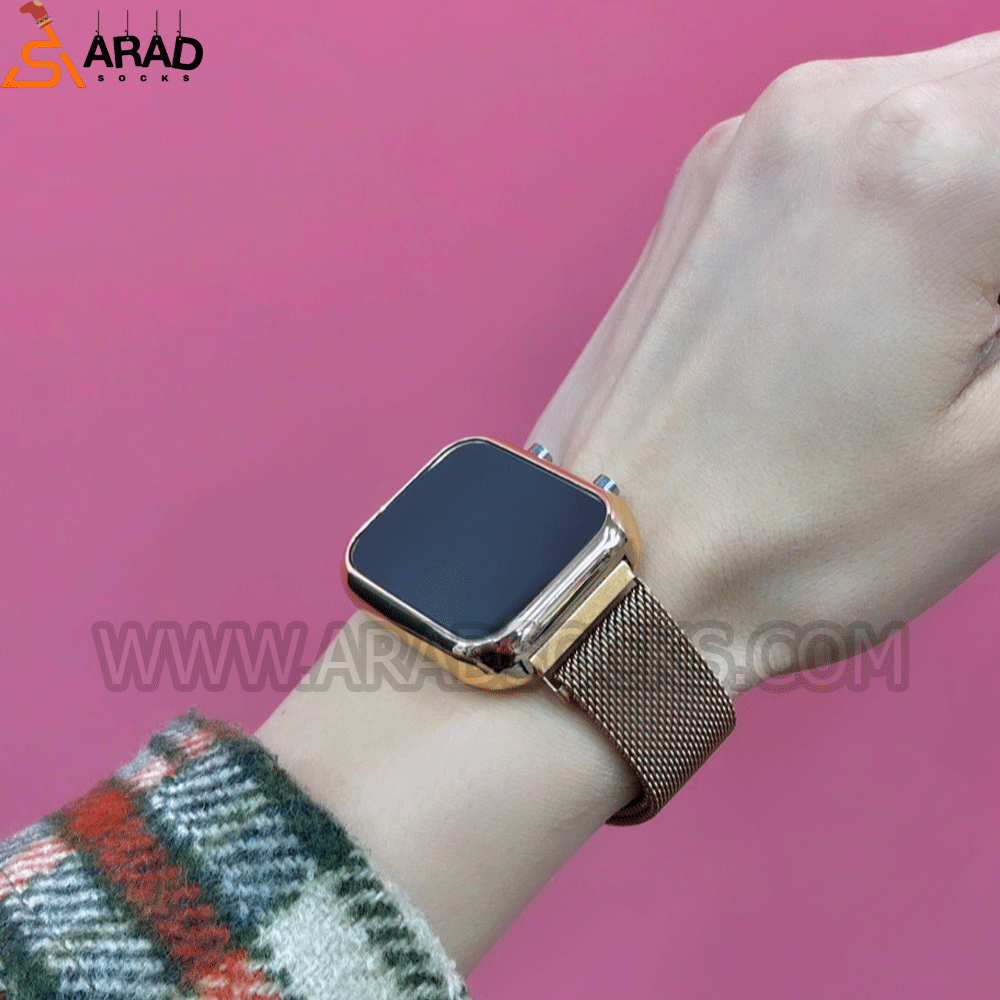 ساعت دیجیتالی مربعی، طرح کپی از ساعت های هوشمند است. بند این ساعت از جنس استیل است و قابلیت تنظیم توسط آهنربا دارد. این ساعت دیجیتالی قابلیت نمایش ساعت و تاریخ دارد، همچنین باتری آن قابل تعویض است.